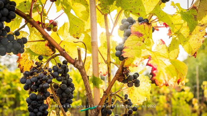 In de wijngaard groeien 17 soorten druiven, zoals de Monarch, een blauwe soort die exceptioneel volle trossen produceert. En de Cantor, een schimmeltolerant ras. Het is niet zozeer klimaatverandering dat wijn uit ons eigen kikkerlandje mogelijk maakt, veel meer de doorontwikkeling van nieuwe soorten die resistent zijn voor ziektes als meeldauw, legt Langeveld uit.