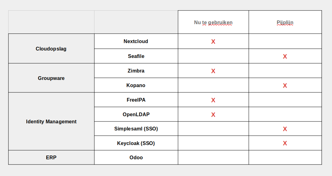 Een van onze basiscriteria is dat we niet willen afhangen van de maker van software, en daarom kiezen we voor opensourcesoftware. Maar zelfs bij opensourcesoftware kan het gebeuren dat de maker de enige integrator is of bijna alle ontwikkelaars tewerkstelt. In dat geval hangen we nog altijd van de goede wil van de maker af.