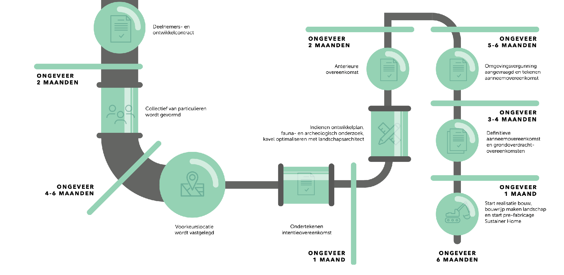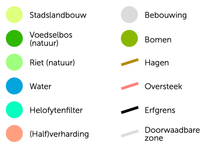 Men koopt een kavel. Om vervolgens een mooie groene wijk te maken, koppelen we zaken als openbaar groen, de doorwaadbare zone, waterberging, afvalwaterverwerking en natuurlijk de buurtweg met omliggende kavels tot een landelijk, logisch en goed werkend geheel.
