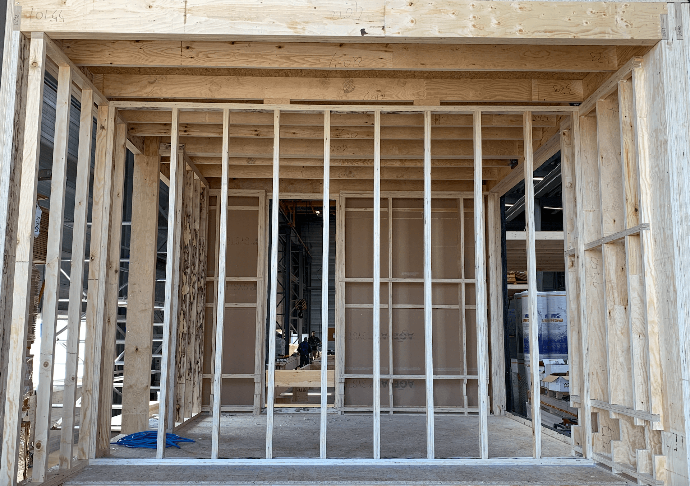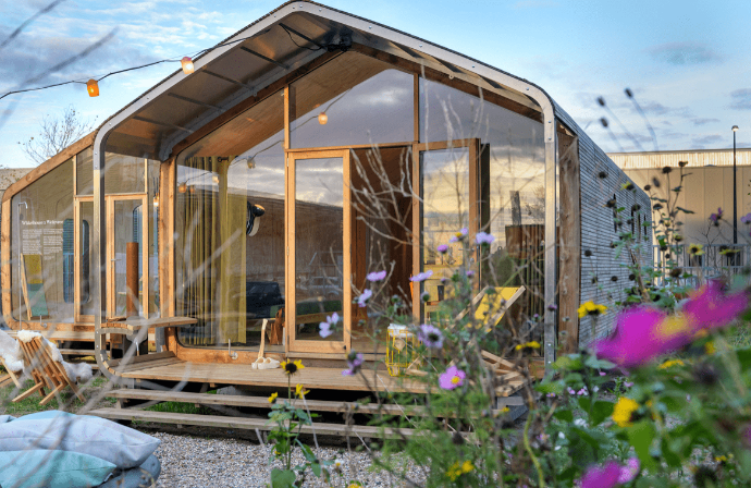 Bouwen/verbouwen op een milieuvriendelijke manier: De woning wordt bijna volledig voltooid in de loods.