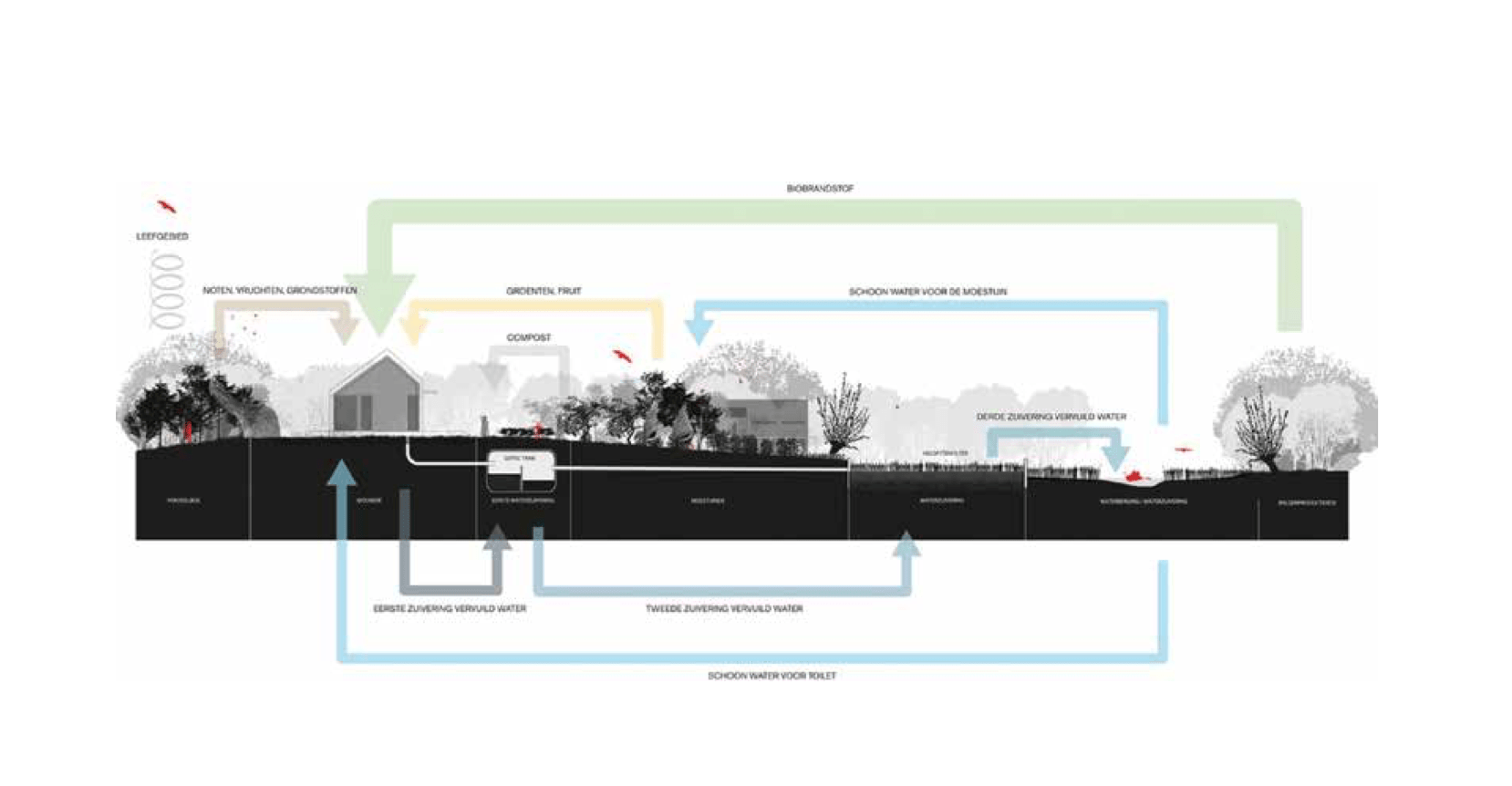 Zelfvoorzienend wonen: energie opwekken; water managen; voedsel verbouwen. |