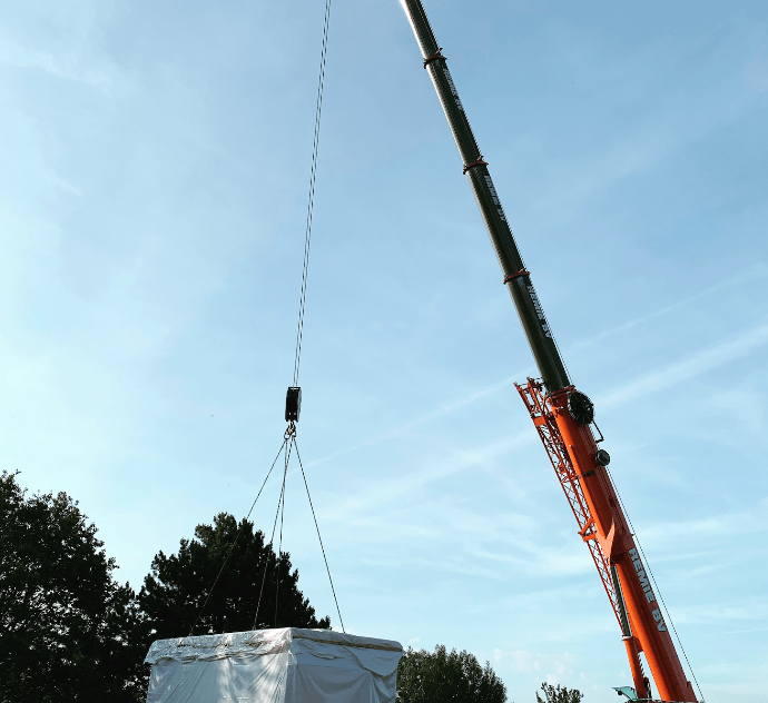 De geprefabriceerde delen van de woning worden zonder hoge stikstof-depositie met lichte, elektrische kranen op de bouwplaats neergezet.