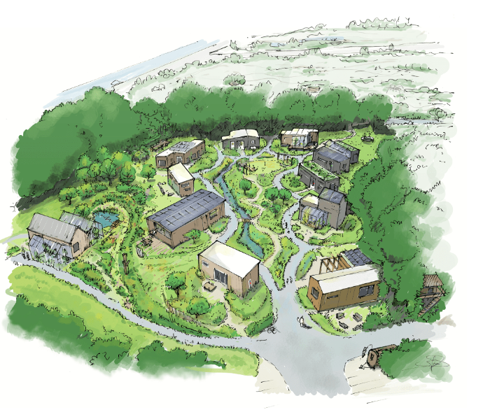 een wijk van 30 klimaatadaptieve en klimaatpositieve huurwoningen, 6 mantelzorgwoningen, buurthuis, kennis- en educatiecentrum, werkplaats en kantoren, met mogelijkheden voor onze eigen voedselvoorziening, onze eigen energievoorziening, ecologische waterzuivering en duurzame ondernemingen.