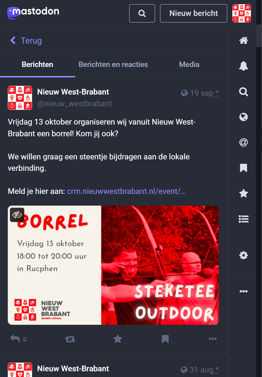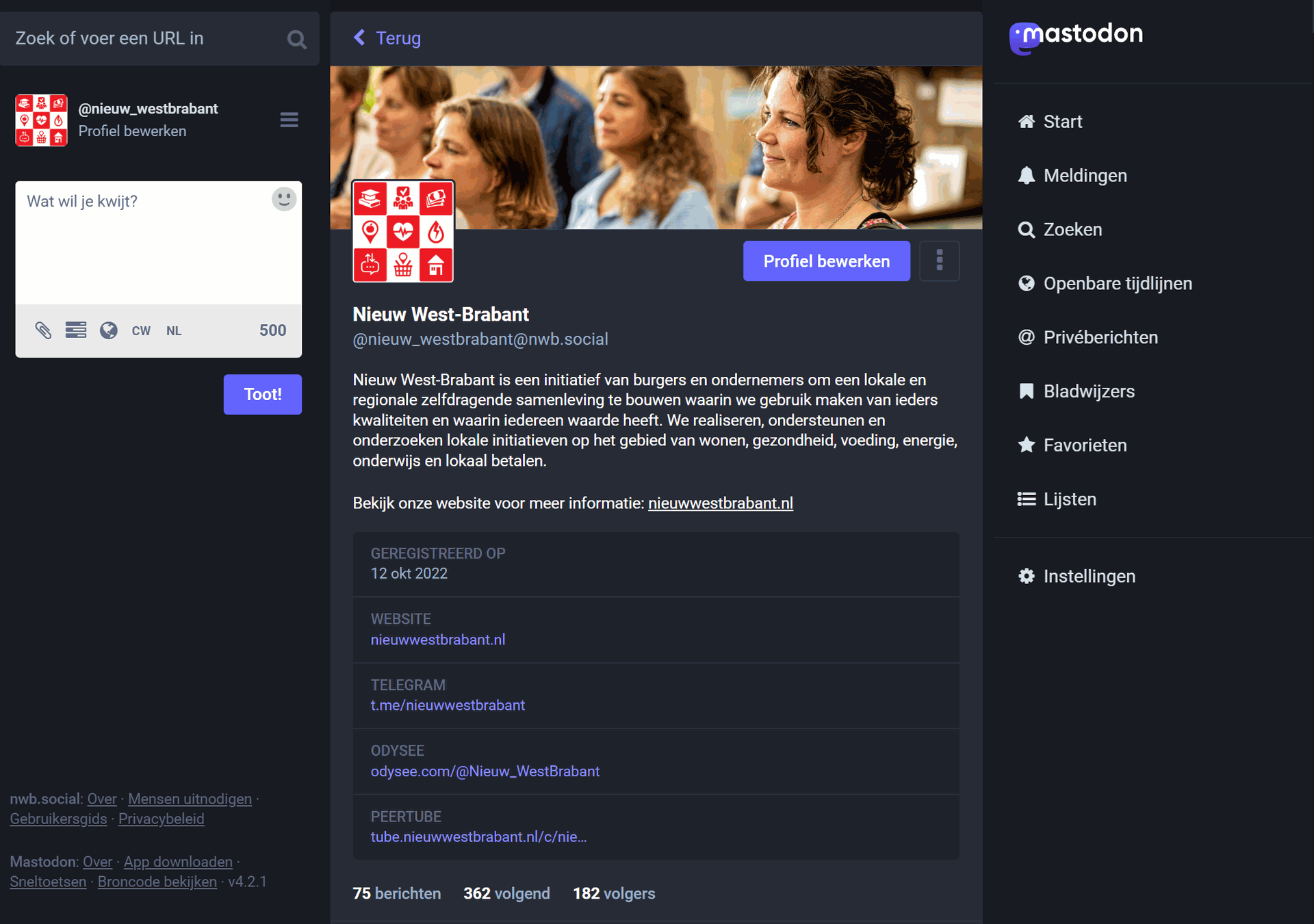 Nieuw West-Brabant heeft een eigen Mastodon instantie opgezet welke je kunt gebruiken.